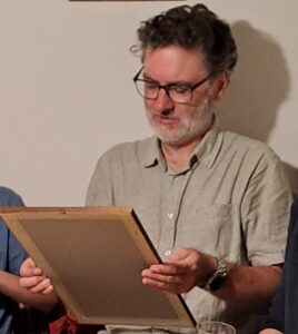 Sie zeigte uns auch ein Geschenk das Sie zu ihrem 60. Geburtstag von Herrn Dr Karl Karasek (damals selbst Kirchenchormitglied) erhalten hat. In der Malerei mit eingebundenem Gedicht wurde ihr Humor, der ihr bis jetzt geblieben ist, hervorgehoben. Ich bewunderte es ausgiebig.